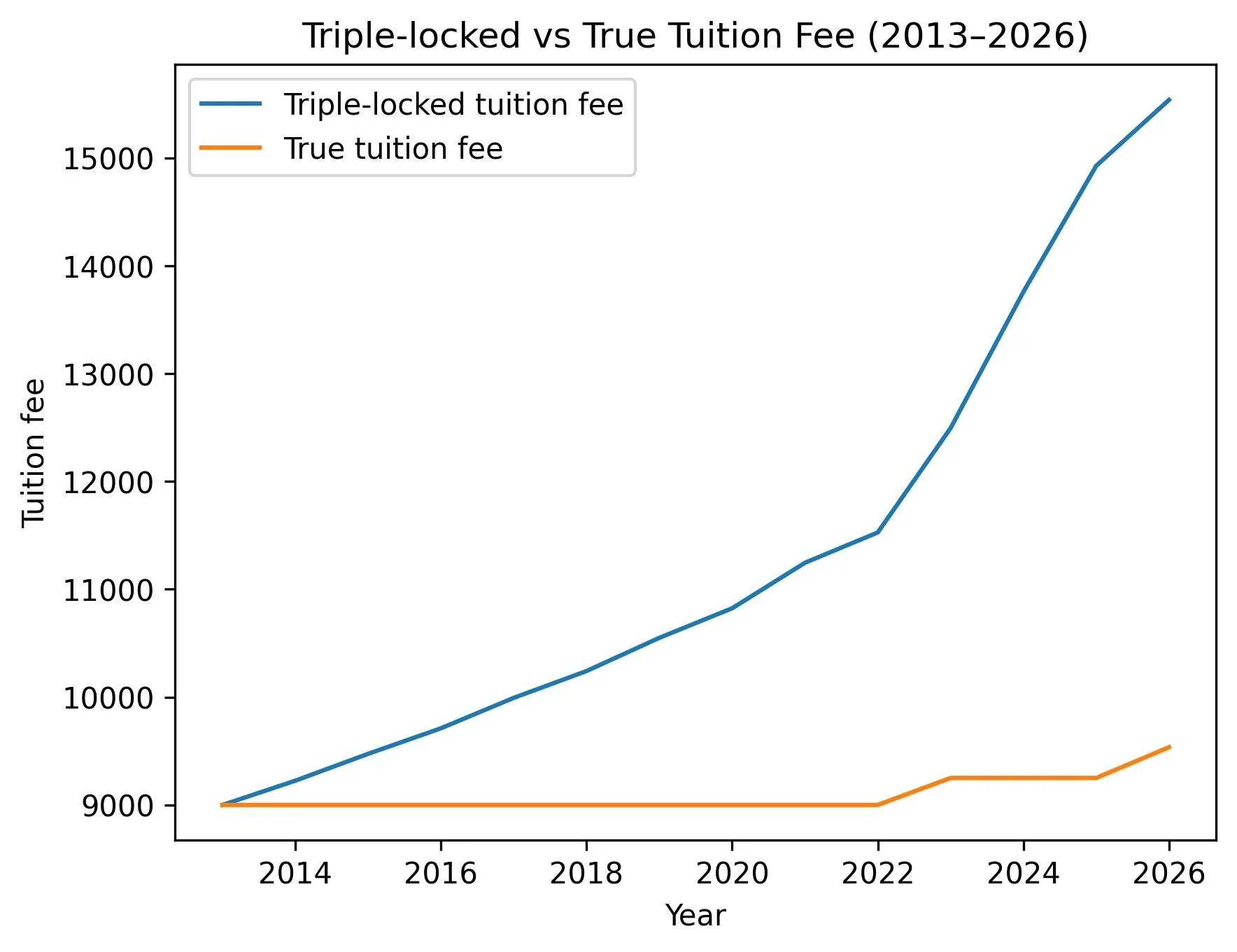 Taking a step or two back from the specific details, the triple lock can be seen as a statement of sustained support for pensioners from the government. I thought it would be interesting to see what a triple-locked tuition fee would look like to compare what sustained support for University teaching would have looked like.
